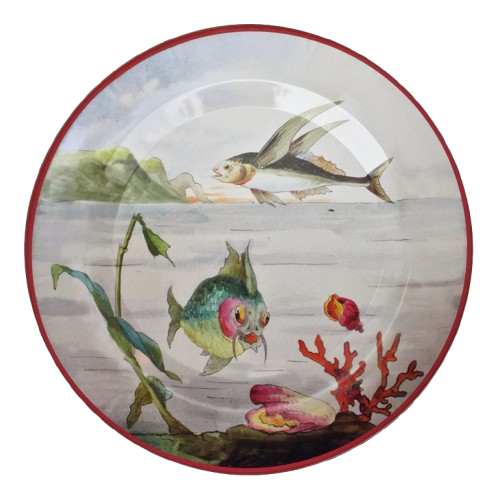 Tin plates decorated with a flying fish and seabed. Scenes are inspired by the french book "Vingt Mille Lieues sous les mers" (* "Twenty thousand leagues under the seas") by Jules Verne, published in 1869-70 by Pierre-Jules Hetzel.